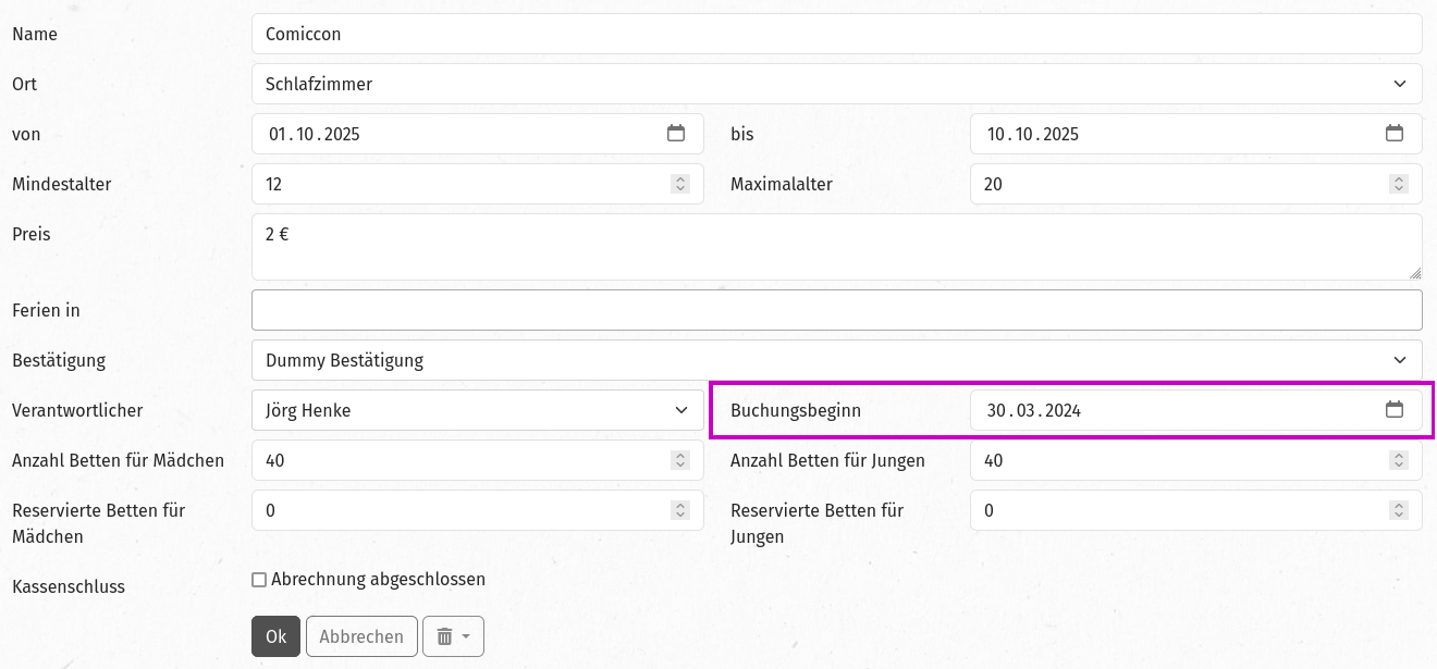 start_bookingint_campeingebaut werden, das ein Datum aufnehmen kann.Anmeldungen sollen dann nur noch ab diesem Datum möglich sein, auch wenn vorher schon die Freizeitdaten eingeblendet werden mit dem Hinweis, ab wann die Anmeldung möglich ist.
